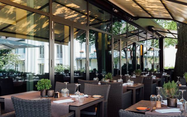 Die mediterran inspirierte Sonnenterrasse „karl - Plaza & Lounge" bietet Gästen und Besuchern einen einzigartigen Blick auf die Park- und Waldkulisse des Kaiser-Karls-Parks und versprüht pures Urlaubsfeeling. Die marsala-farbene Sommerbar und ein Loungebereich mit fünf Sitzgruppen rund um ein begrüntes Wasserbecken mit Sprudelstein laden ein zu Aperitif oder einem Cocktail und Snack bei Sonnenuntergang. Highlight ist eine fest installierte Gas-Feuerstelle an der Spitze der Terrasse mit Blick auf die große, beleuchtete Fontaine im Zentrum des Parks. Sommerliche Genüsse bietet zudem der mit Marquisen, Sonnenschirmen und Heizstrahlern ausgestattete Restaurantbereich vor der Kulisse einer imposanten Eiche.